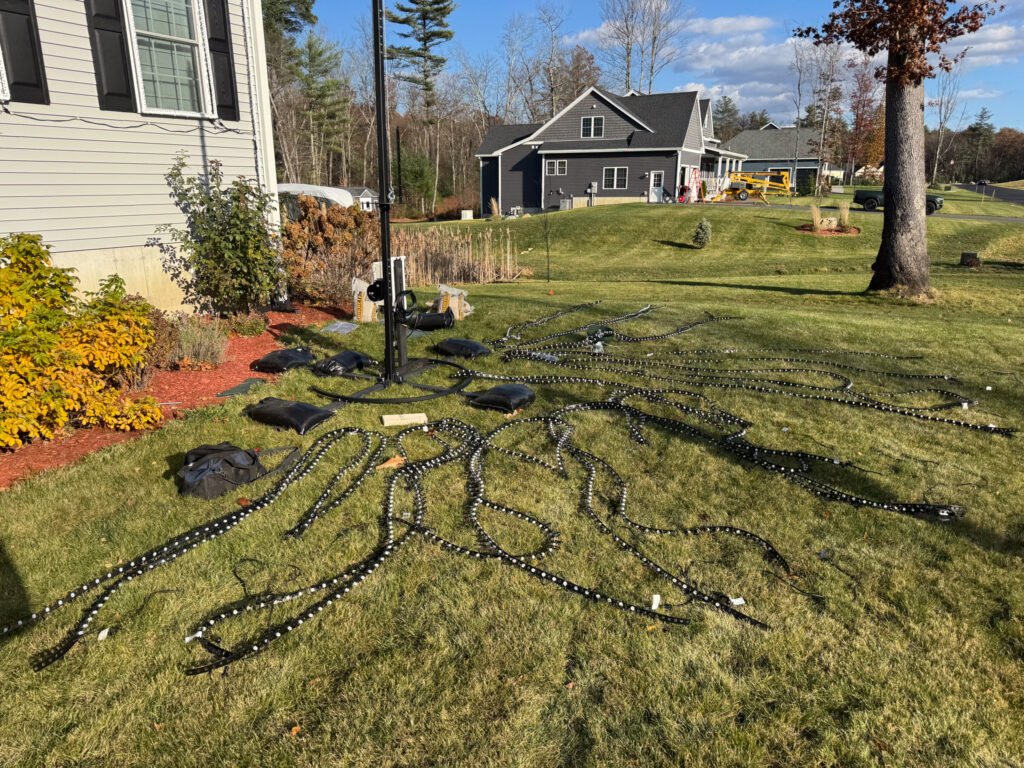 Before we dive in, here’s what I ended up with: a 14-foot tall, 5-foot wide beast using parts from Mattos’ Sasquatch MegaTree kit. I’ve got 1,800 pixels spread across 12 strings (150 pixels each) with 2-inch spacing between lights. The whole thing sits on an 8-foot steel base, secured with 2 guy wires and about 250 pounds of sand.