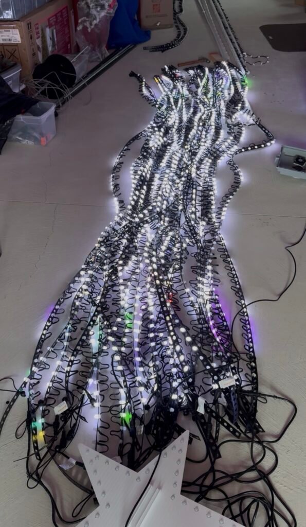 Why those dimensions? I wanted the tree to be an undeniable statement piece: tall enough that people driving by couldn’t miss it. But I also wanted the pixel strands relatively close together (hence the 5-foot wide base) because tighter spacing makes animations easier to see. After visiting a bunch of shows this past season, I noticed my tree is narrower than most, and honestly? I love it. The animations are crisp and clear.