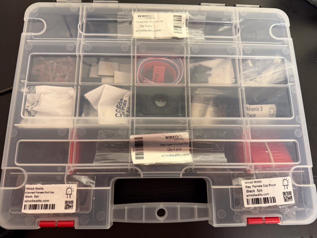 You are going to have so many spare parts. You need to keep them organized. When a pixel goes dark you don’t want to waste a bunch of time and energy finding fittings, clickets, wire, etc.